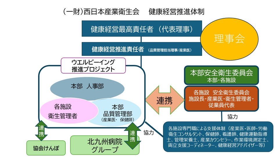 - 健康経営最高責任者を代表理事が担い、健康経営推進責任者を品質管理部担当理事/産業医に任命し、多様な専門職・委員会等と連携しながら健康経営を推進しています。